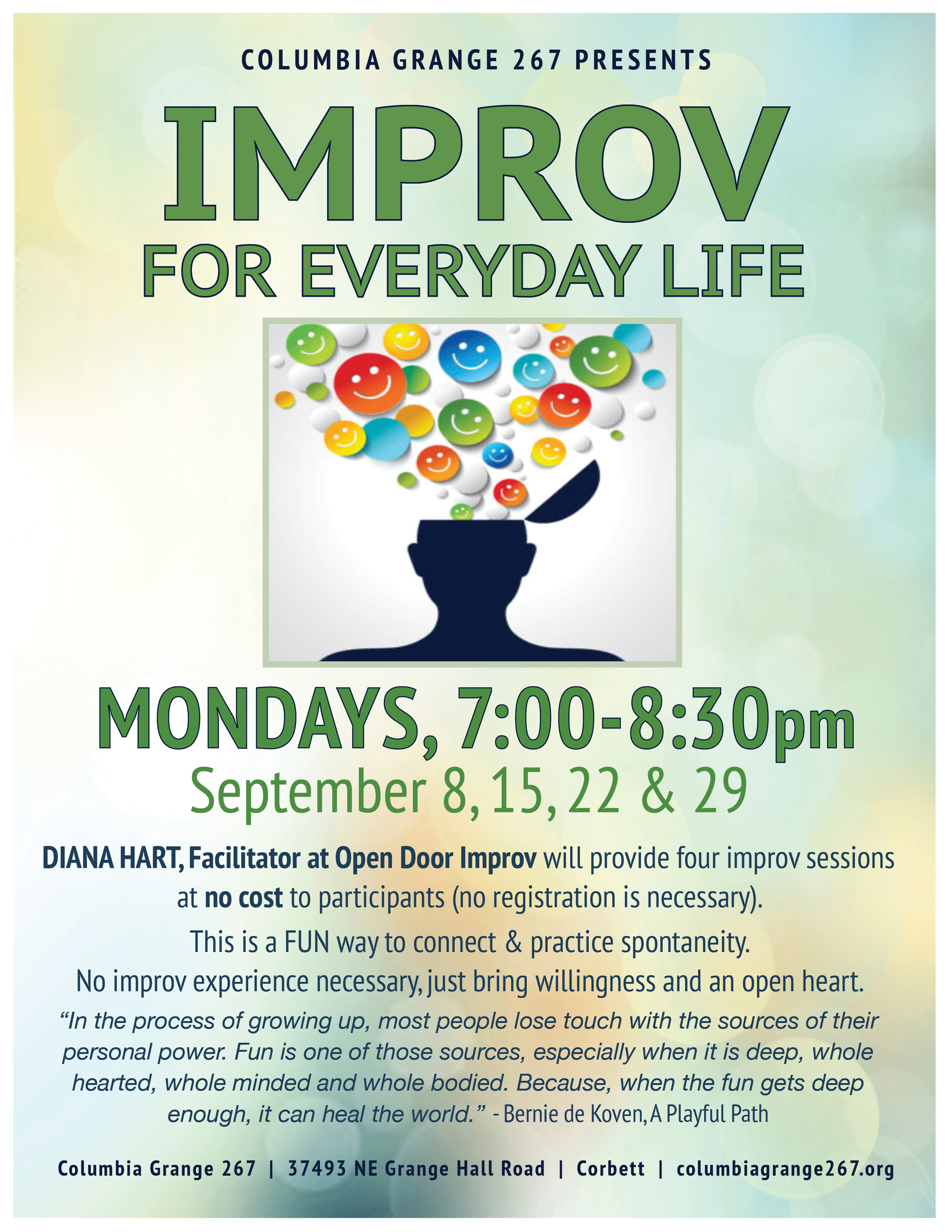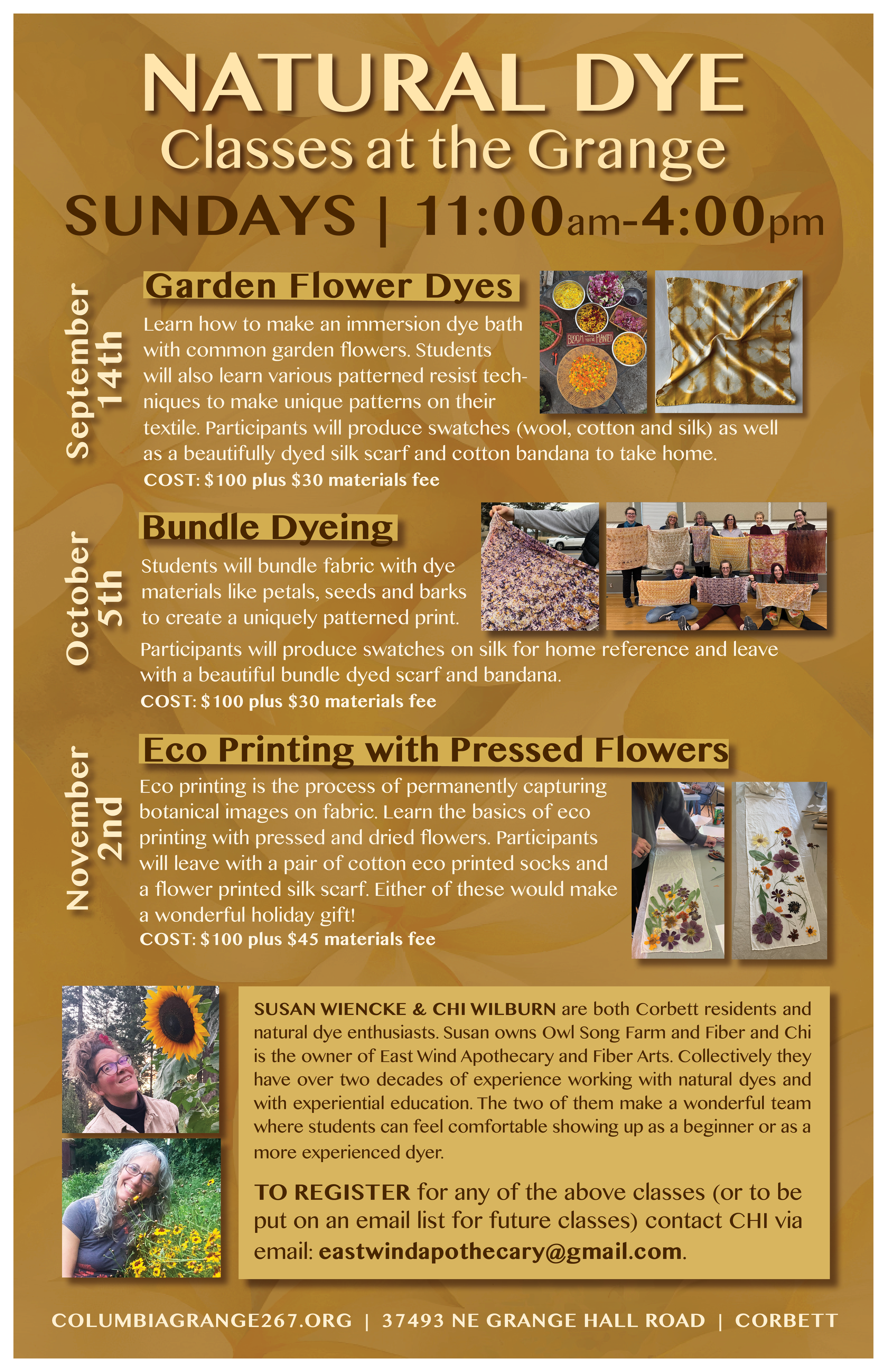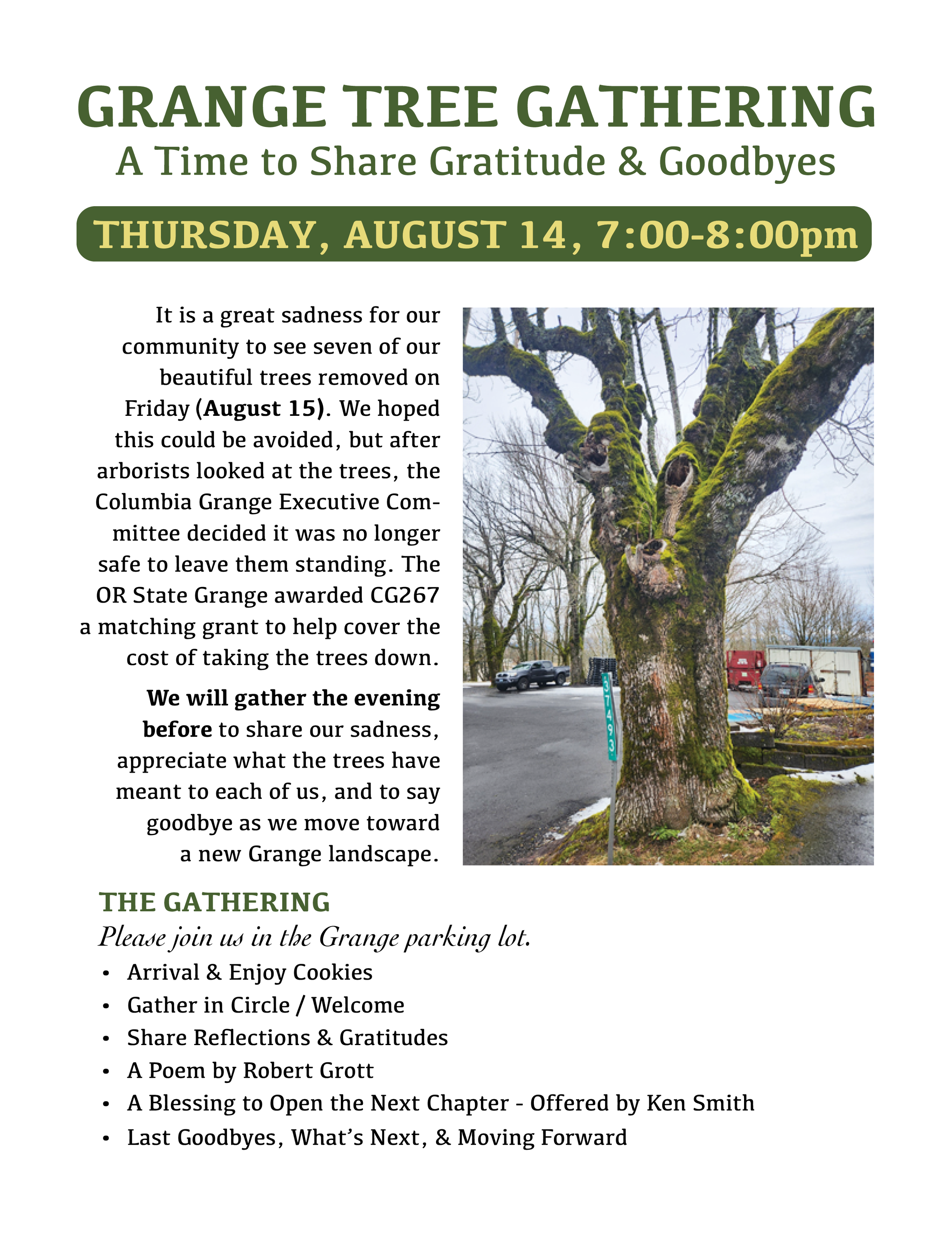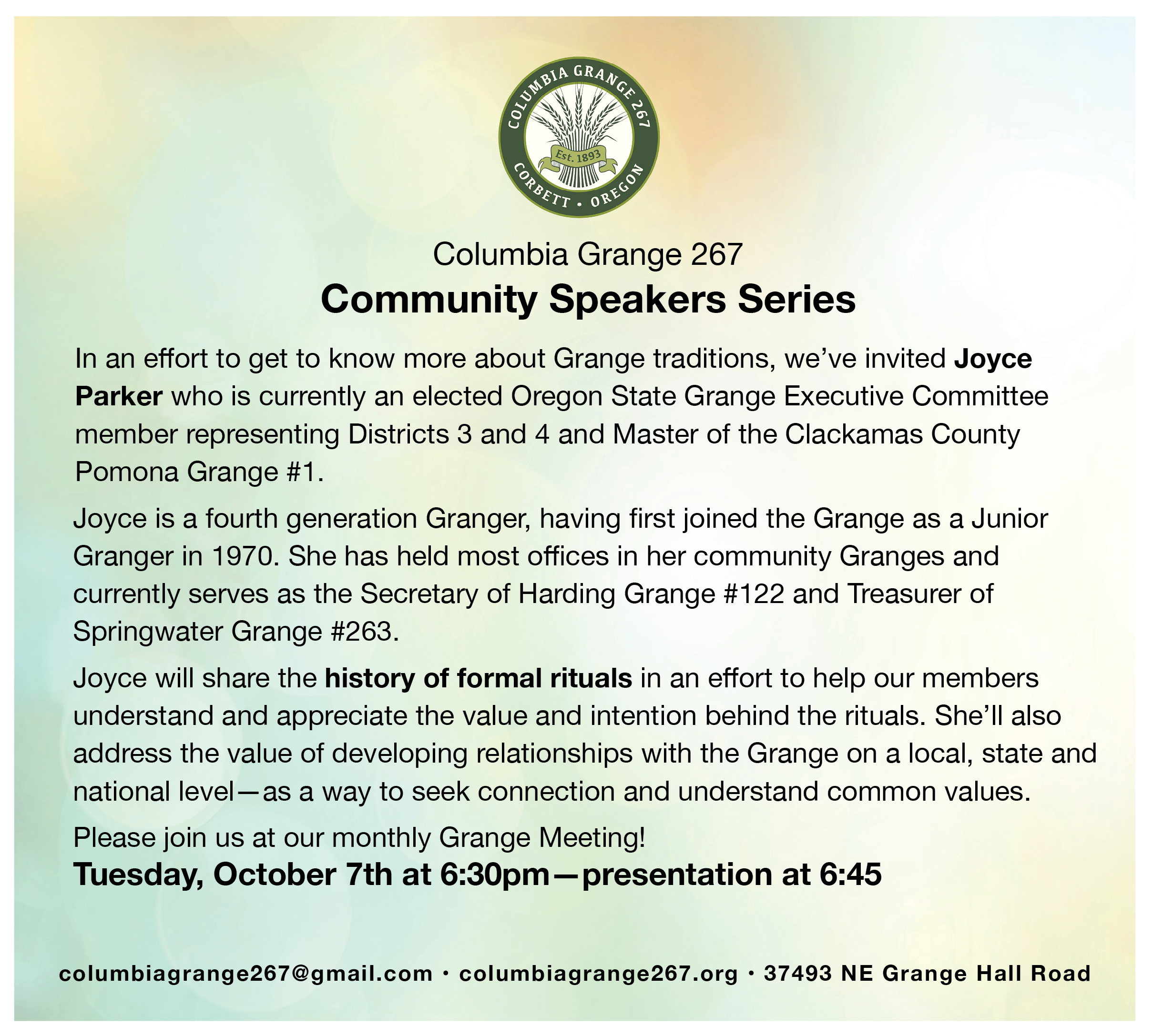 Columbia Grange 267 is thrilled to play a part in this year’s Oregon State Grange Convention being held in Corbett from June 21 to 26. The Grange was originally an agricultural fraternal organization, and although we now include most professions, our agricultural roots are strong. The State Grange conference brings together the members of Oregon's far flung subordinate Granges. As part of this grand event, our local Columbia Grange 267 is hosting the Ag Tour and working with June Colony, Agriculture Director of the Oregon State. The Oregon State Grange Convention’s Saturday farm tours have become a favorite adventure, and we gather around 20 persons and load into a bus to tour local farms and other agricultural businesses. Participants enjoy traveling, learning, and meeting with the locals on their farms. The theme of this year’s tour is Agriculture and Community and it will include a morning Tour leaving from the Columbia Grange Hall, followed by lunch and a Meet the Farmers Get Together after the tour. We’ll serve a salad mix and finger food. The Ag Tour will include farm animals, produce, blueberry, CSA, farm stand, and lavender farms. Our tour includes not only farmers sharing their operations, but also farms active in community support and education through farming and rural life -- all with great stories to share about agriculture’s role in rural community life and health. Our afternoon Meet and Greet will host other local farmers not on the tour as well as local organizations including Multnomah County Soil and Water Conversation and Helping Hands, a food bank that works out of our Columbia Grange Hall. We have two buses that hold 10 people each so act now if you want a seat on the bus. We will work with additional registrants to arrange carpools. The tour schedule is still being organized and details will follow. Registration Deadline: June 1st. To register, Call: 503 789 7542 (leave a message with registration information if no answer) Email: columbiagrange267@gmail.com Subject Line: State Convention Ag Tour Mail: COLUMBIA GRANGE 267, 37493 NE GRANGE HALL RD, CORBETT, OREGAN 97019 ATTENTION, SARA GRIGSBY Include: • Name(s) • Your Grange • Email address(es) • Phone #s