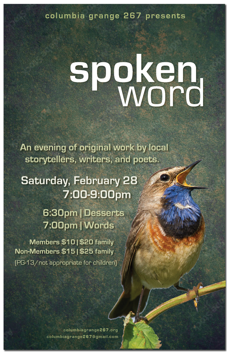 Spoken Word Saturday, February 28, 2026 6:30 PM 9:00 PM 18:30 21:00 Columbia Grange 267 37493 NE Grange Hall Rd Corbett, Oregon 97019 (map) Google Calendar ICS