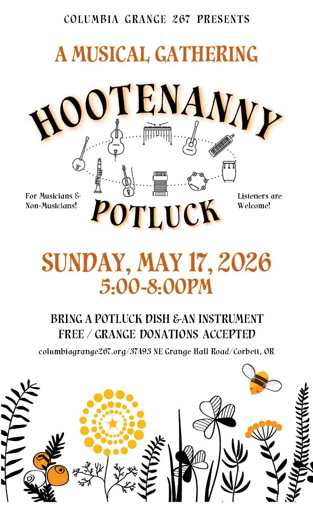 Hootenanny Sunday, May 17, 2026 5:00 PM 8:00 PM 17:00 20:00 Columbia Grange 267 37493 NE Grange Hall Rd Corbett, Oregon 97019 (map) Google Calendar ICS