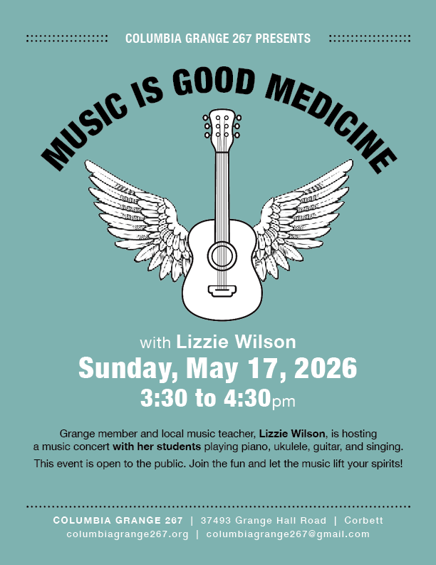 Music is Good Medicine Recital Sunday, May 17, 2026 3:30 PM 4:30 PM 15:30 16:30 Columbia Grange 267 37493 NE Grange Hall Rd Corbett, Oregon 97019 (map) Google Calendar ICS